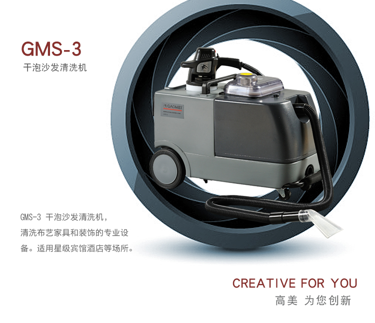 GMS-3干泡沙發清洗機,融入專利發泡技術(ZL032212437 ),泡沫制造,電動刷洗、真空抽吸三合一,是清洗各種布藝家具和裝飾的專業設備。配用清潔劑:干泡地毯水,地毯除漬劑,化泡劑。